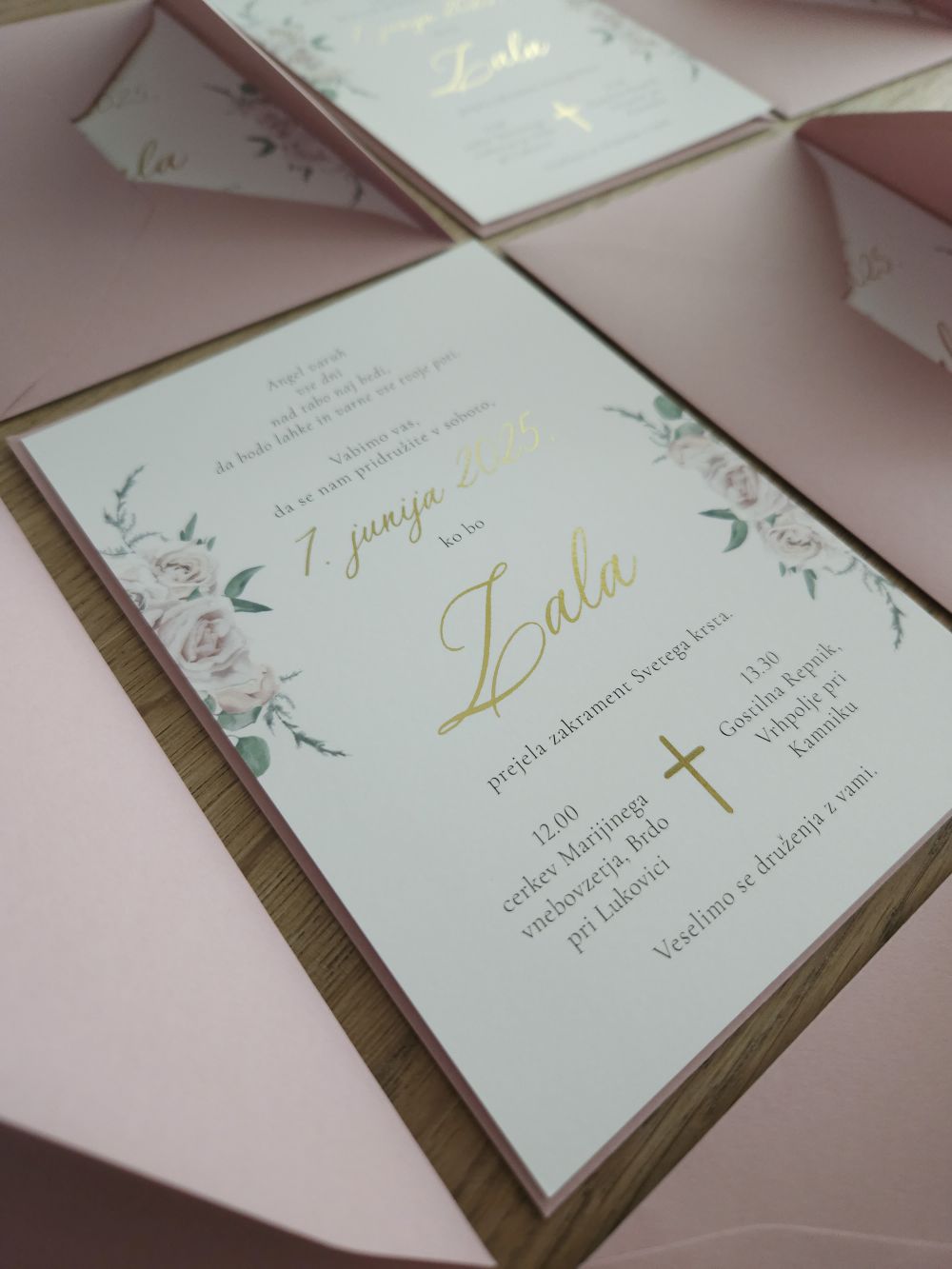 Dodatek na fotografiji – pisemska ovojnica v prašno roza barvi ni vključena v ceno vabila. Izberete jo opcijsko med dodatki.